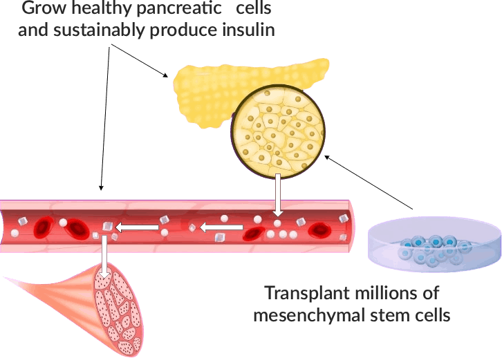 Stem cell treatment for diabetes may involve intravenous and localized injection of up to 800 million vibrant pluripotent stromal mesenchymal stem cells (ideally 3 million MSCs / kg of body weight) as well as alternative and regenerative treatments. These stem cells have the potential to grow into new healthy pancreatic cells including beta cells.